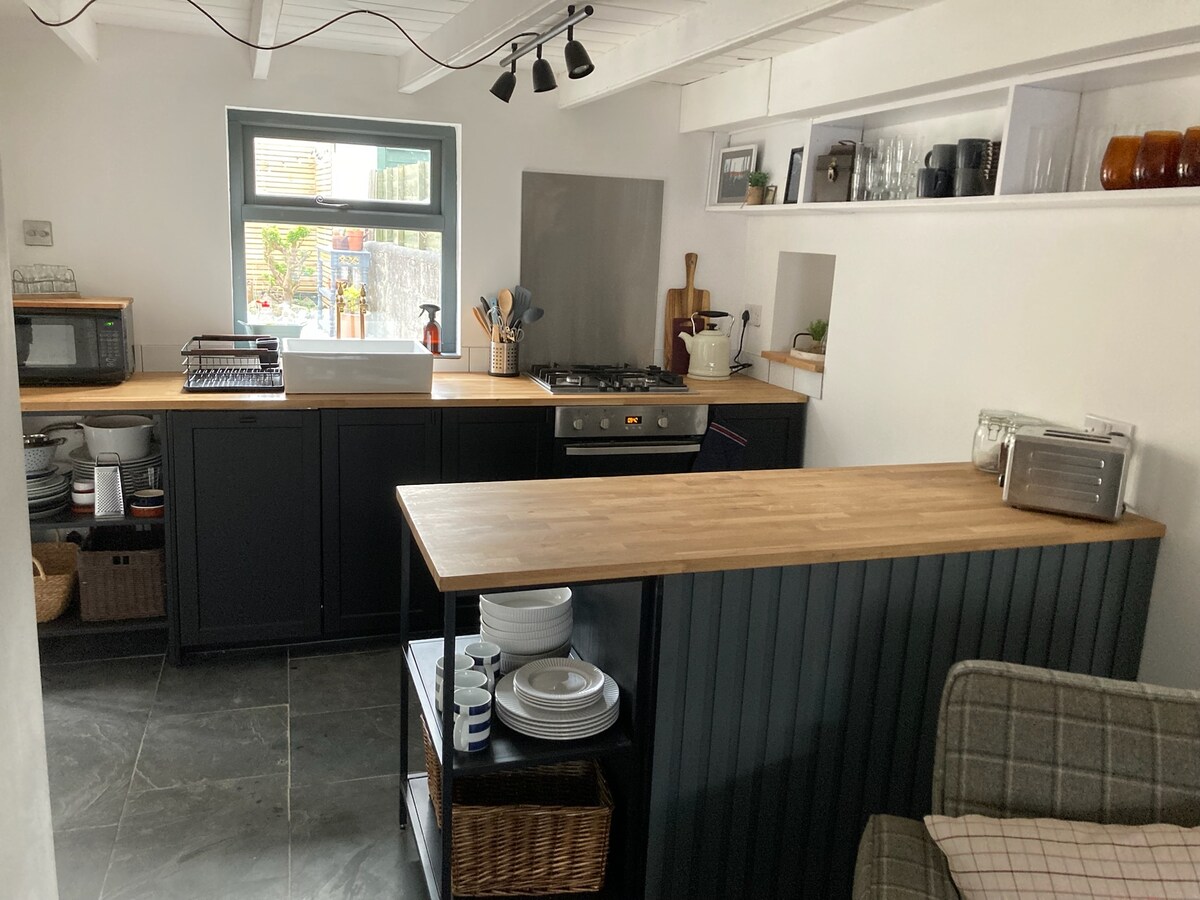 Take a restful retreat in our Scandi inspired Cornish cottage, tucked away on a pretty side street, yet moments away from Helston town centre with shops, cafe's, a small cinema and the CAST arts centre with pottery and yoga on your doorstep. Just a short drive to the sea and acclaimed restaurants of Porthleven. Watch the sunset from the window seat with views across the valley, while sounds of the church bells and the Helston brass band waft through the air.