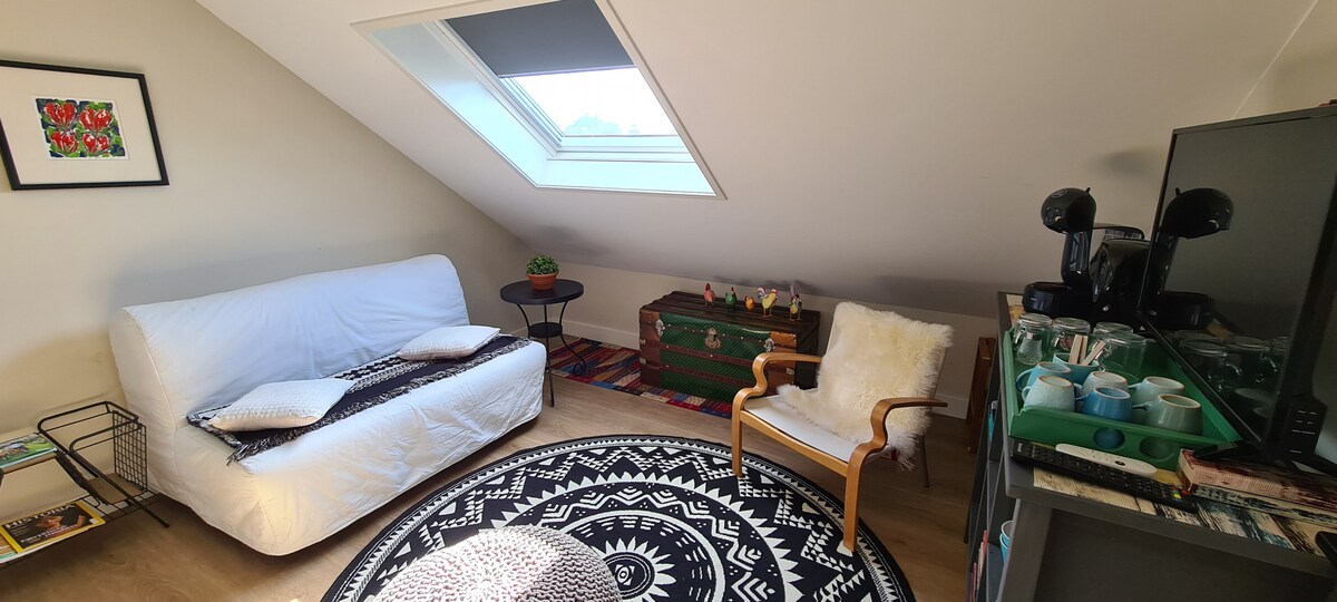 Midden in de mooie Betuwe vindt U ons, vlakbij de snelweg A2 en op 2 km afstand van treinstation Geldermalsen: 23 treinminuten naar Utrecht en 16 minuten naar Den Bosch. Bijzonder fietsen over dijken van de mooiste Betuwse dorpen aan de Linge Bij ons logeert u in een particulier huis, maar U heeft alle privacy, van een eigen badkamer met inloopdouche, toilet en wastafel. Zeer geschikt om dagtochten te maken e.d Ruime slaapkamer, grenzend aan zitkamer met koffieapparaat/waterkoker en slaapbank.