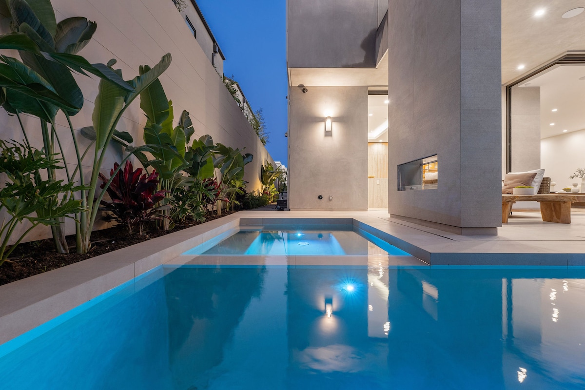 Modern & spacious LA Dream Home: stunning open-plan living area with disappearing 12ft glass doors reveal a serene backyard, infinity-edge pool, hot tub, and outdoor dining beside a cozy fire pit. ☞ Pool + Hot Tub + BBQ ☞ Every Bedroom: bathroom + walk in closet+TV ☞ Private backyard + dogs OK* ☞ Fast wifi + Alexa 10 min → WEHO 20 min → Universal 30 min → DT LA ***SEE HOUSE RULES: The neighborhood is on high alert for disruptive guests. You will be fined $1000 and evicted***
