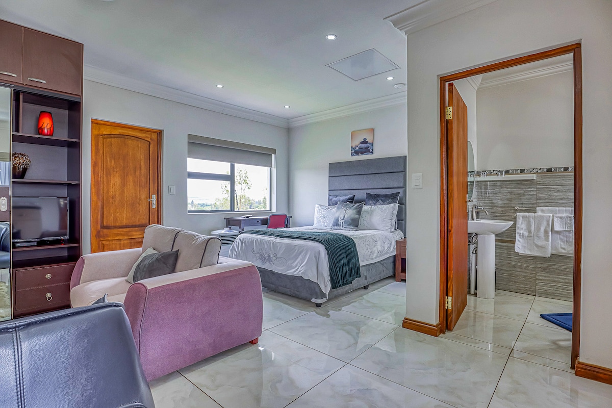 Cozy and inviting, this charming cottage is ideal for couples or solo travelers. Just steps away from Kloofendal Nature Reserve, it features an open-plan living space with a comfy bed, dining area, well-equipped kitchen, shower, toilet, TV, and free WiFi. Guests enjoy full access to a large pool and portable braai facility. Bonus: Johannesburg water cuts won’t affect your stay — the property has a consistent water supply year-round. A peaceful retreat where nature and comfort meet.