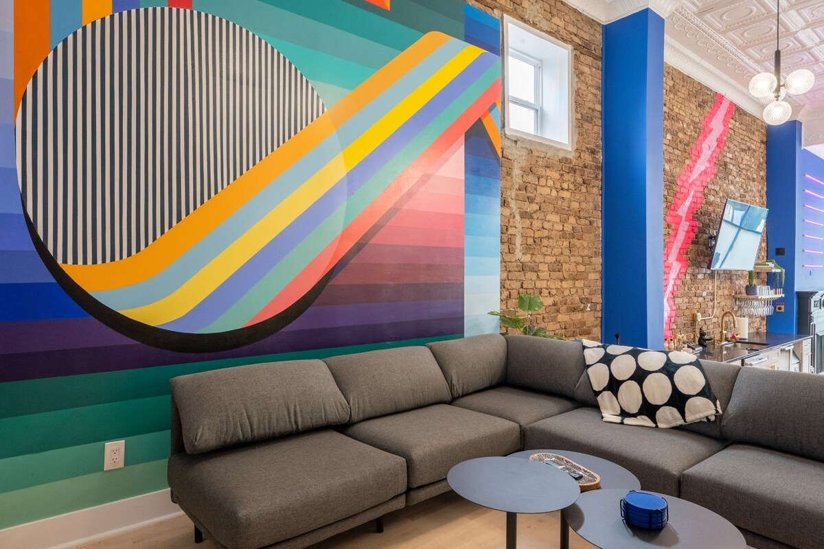 Massive 4 bedroom space in Chicago’s River West Neighborhood that sleeps large groups. Perfect for bach groups, family vacas, and corp events. Features large entertaining space with pool table, 2 arcades, fully equipped bar, record player, and massive TVs with Youtube TV and Netflix. One parking spot provided with easy street parking nearby. 5 min Uber to Fulton Market; Chicago’s hottest restaurant/bar scene. Easy access via public transit and car. Centrally located to all Chicago has to offer!