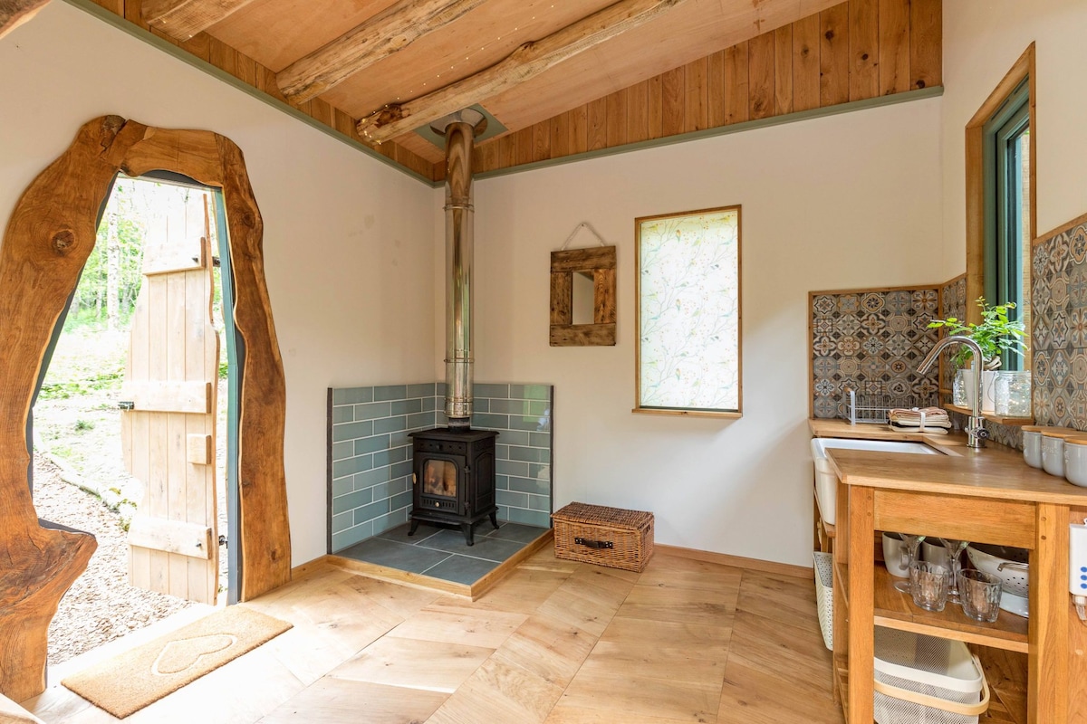 Ova zapanjujuća ručno izrađena brvnara je majstor talentovanog zanata u Saseksu. Izgrađena je pomoću održivog hrasta, kestena i pepela iz okolnih šuma. Prepun je predivnih detalja, na primer ulaz u brvnaru inspirisan morskom pećinom u Kornvolu. Njegova tajna lokacija je kao drugi svet, na obali iznad vijugavog potoka u preplavljenoj svetlosti starih hrastova. Vazduh je pun ptičje pesme, a jeleni slobodno trče svuda unaokolo.