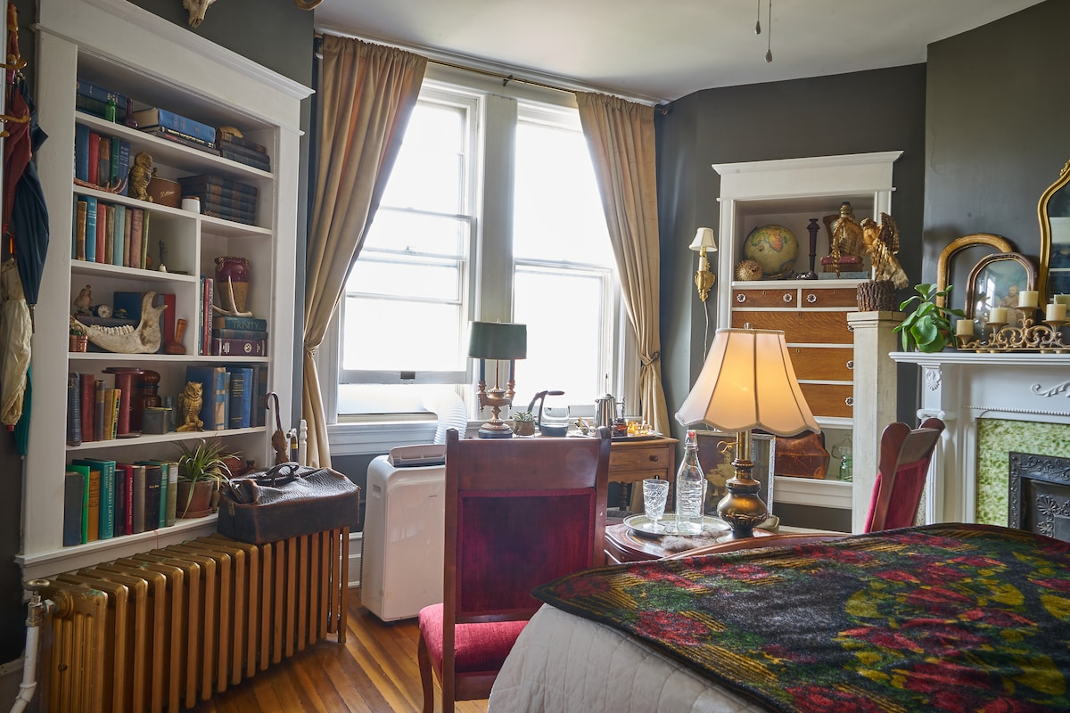 5 minuta/2,5 milje do nacionalnog parka New River Gorge i mosta u centru Fajetvila, WV! Smještena na drugom spratu istorijskog prenoćišta Morris Harvey House Inn, The Library Room je ispunjena neobičnim blagom, zanimljivostima i rijetkim romanima. Uđite u dušek Tuft & Needle i luksuzne čaršave na složeno izrezbarenom starinskom bračnom krevetu. Samo za uzrast od 8 i više godina EV CHARGING- Nudimo punjač Tesla nivoa 2 za potrebe punjenja preko noći. To je dodatnih 10 $ po noćenju.