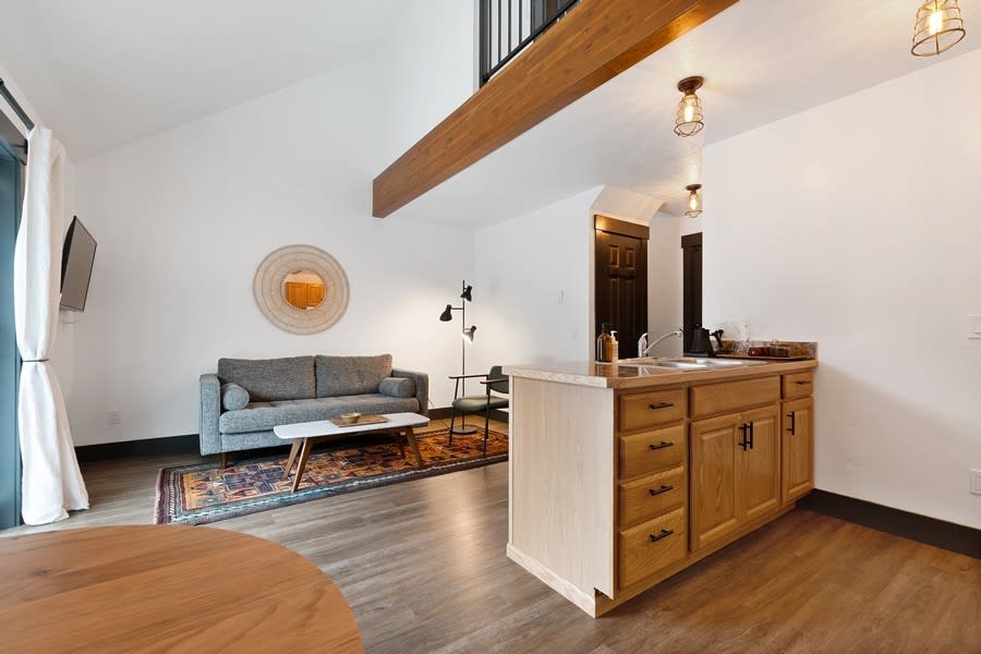 The Lake Loft is a cozy, modern studio, in the heart of downtown McCall. Ovaj stan ima potpuno opremljenu kuhinju sa radnim površinama od granita, posuđem i mašinom za pranje sudova. Ovo je savršeno mjesto za romantični odmor, poslovne putnike, goste na vjenčanju ili tročlanu porodicu koja će istražiti Mekol. Potkrovlje na jezeru ima dovoljno sunčeve svjetlosti i ima zavjese za zamračivanje za miran san. Stan se nalazi na drugom spratu, do njega se dolazi stepenicama ili liftom.
