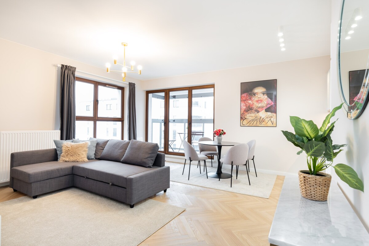 Udoban, potpuno opremljen stan u novoj zgradi. Dnevni boravak sa otvorenom kuhinjom podeljen na trpezariju i prostor za sedenje. Spavaća soba ima veliki krevet i prostranu garderobu. Postoji i ormar kao dodatni prostor za odlaganje. U blizini ima prodavnica, restorana i kafića Oprema: klima-uređaj, aparat za espreso, kuvalo za vodu, pegla, daska za peglanje, veš mašina Dolazak sa aerodroma Šopen 20 min. taksi 50 min. komunikacija od aerodroma Modlin 50 minuta taksijem 120 min komunikacija