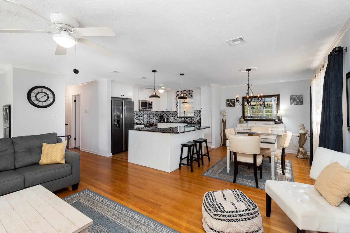 ❤️ SAVE US TO YOUR FAVORITES • 1 min to the beach 🌊 • Professionally cleaned • Super host service 🏆 • Sleeps 1 - 8 comfortably 🛏️ • King bedroom and half bath👑 • Queen sleeper & fireplace 🔥in cozy flex room • Full bunks w trundle bed, neon surfer sign & arcade games • Fully stocked kitchen • Keurig Coffee bar ☕ • Washer/dryer 🧼 🌴 Patio w/lounge chairs, tiki lights, fire pit, cornhole • 2 outdoor showers 🚿 • Walk to dining 🍽️ • Rocket launches 🚀+ Nightlife • Free bikes 🚲,beach gear 🏖️