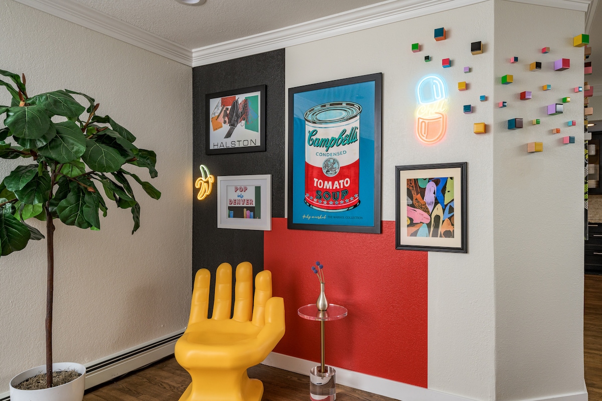 Ova jedinstvena, super zabavna moderna kuća sa temom pop umetnosti će zasigurno inspirisati! Luksuzna kuća nalazi se 9 minuta od centra Denvera i spava 16 osoba u krevetima, sa 3700 kvadratnih stopa stambenog prostora na ogromnoj privatnoj parceli od 1/3 hektara. Ima 6bd/3ba, potpuno opremljenu kuhinju i zasebnu čajnu kuhinju, dnevnu sobu, igraonicu sa igraonicom i bioskopsku sobu sa ekranom od 4K od 100inča i surround zvukom. Vanjski prostor je savršen za okupljanje, sa natkrivenim sedištima oko ognjišta i kompletnim trpezarijskim setom na otvorenom.