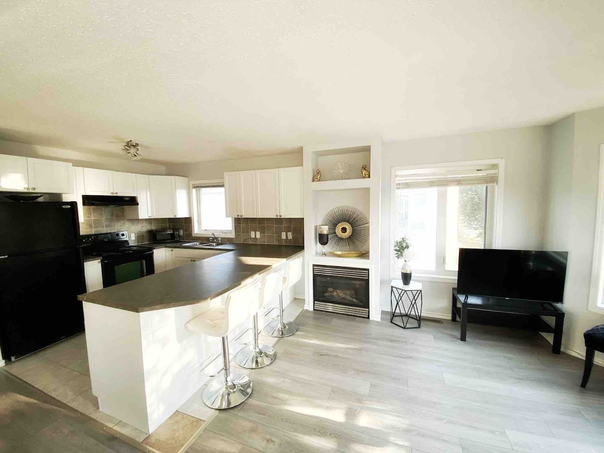 This lovely open concept 1,200 sq Townhouse, has been newly renovated and furnished with high quality furniture. Perks include - fireplace, furnace and air-conditioning, two spacious bedrooms and one bath. Being Centrally located and steps away from transit and beautiful parks. Minutes from all amenities including; hospital, shopping, leisure center, daycare and fitness facilities. Enjoy the convenience of private parking pad and quick access to the main highway.