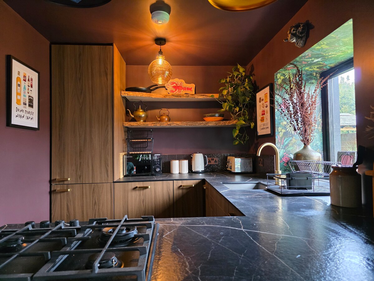 Smješten u podnožju Kejvhila, s pogledom na zadivljujući pogled na Belfast, ovaj luksuzni stan s ograđenim vratima savršen je skriveni smještaj. Možete da se opustite u hidromasažnoj kadi i uronite u bazen na privatnom balkonu dok posmatrate živopisna svjetla grada, a možete i da prošetate kroz pećinski vrt i posjetite dvorac Belfast i Napoleonov nos - oba su vam na pragu! Takođe ste na samo 10 minuta od centra grada Belfasta gdje možete uživati u svim znamenitostima, kupovini i restoranima koje Belfast nudi.