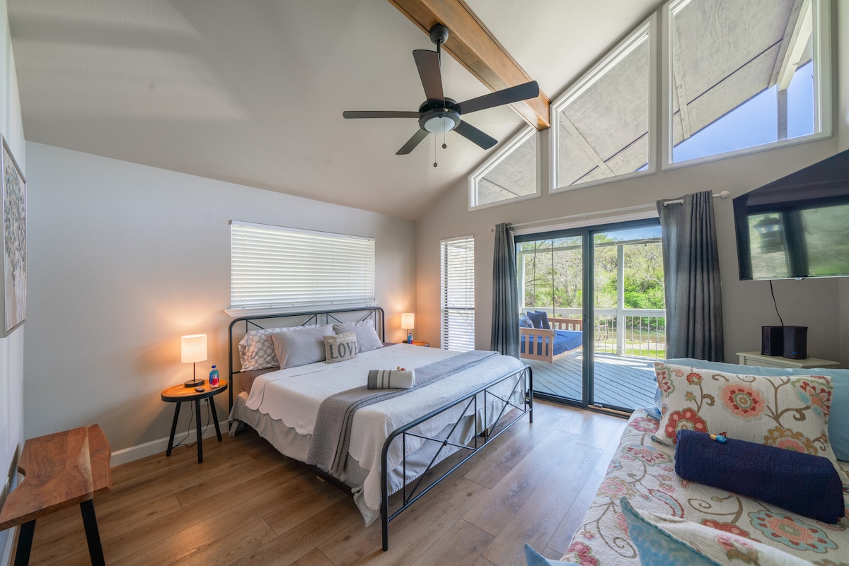 ***Sada nudi masaže za parove **** Samo dvije milje od potkove na rijeci Gvadalupe, ova udobna seoska kućica na jezeru Canyon nalazi se ispod drveća, nudeći privatnost i odličan pogled na divlje životinje Hil Kantrija. Unutra ćete pronaći bračni krevet (širine 150-179 cm) i bračni krevet (širine 150-179 cm) u dvije udobne spavaće sobe, od kojih svaka ima svoje privatno kupatilo i tuš-kabinu. Kompletna kuhinja olakšava kuvanje, a imaćete i trpezarijski sto za četvoro, mašinu za pranje i sušenje veša, Roku TV od 65inča i svjetlovodni internet kako biste ostali povezani.