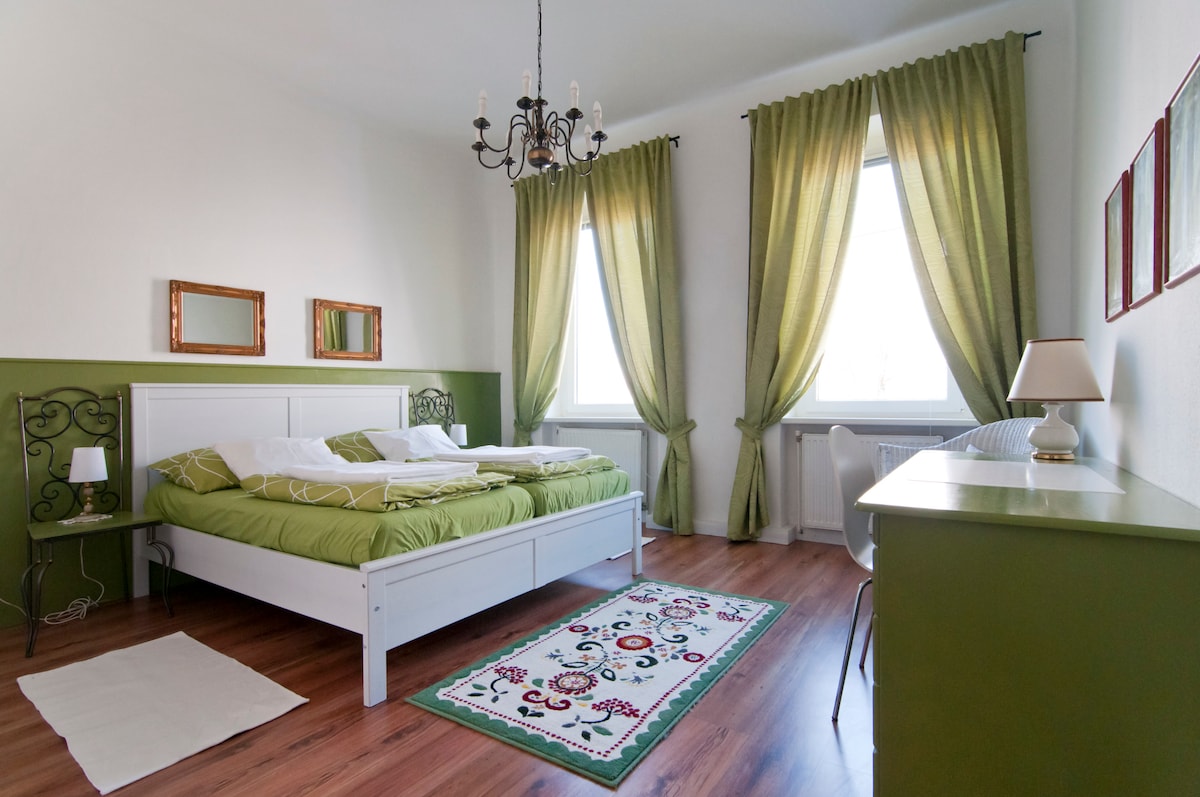 Treći stan u našoj 140 godina staroj gradskoj kući pruža 120 m² stambenog prostora, klimatizovan, tri spavaće sobe, dva kupatila, dva WC-a, besplatan parking, što je idealna ponuda za srednje porodice ili grupe.
