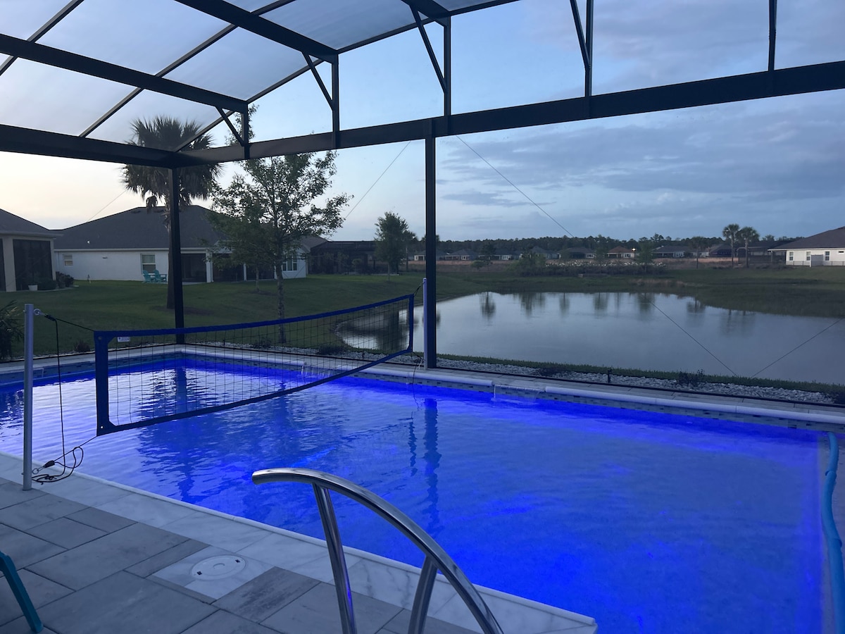 This designer home is in the Village of Cason Hammock. Cason Hammock is centrally located and within walking distance to Sawgrass Grove and Ezell Recreation Center. The home fits up to 6 guests. The living area features a sectional sofa, fireplace, and a 65" TV. Master suite has a king-size bed, 65" TV, in-suite bathroom with walk-in shower. Guest bedrooms have queen beds. A glassed-in lanai and birdcage with fun LED lighting and a practice putting green. Free Golf Cart included (4 seats).
