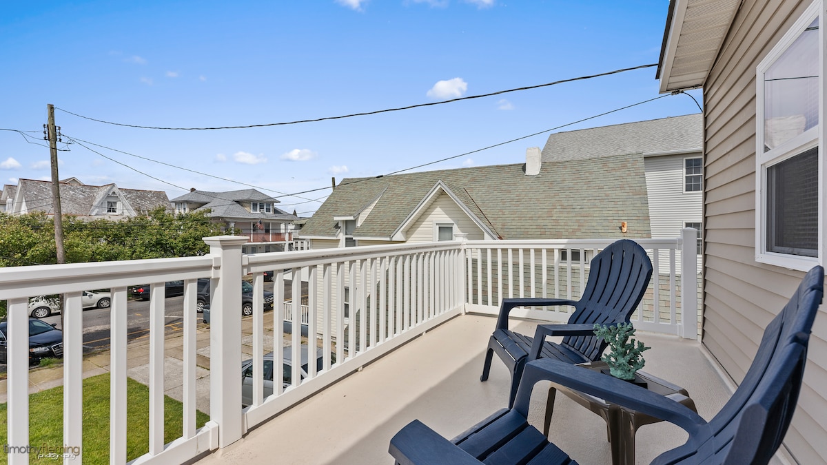 Ažurirana kuća u nizu sa 3 bds, 2 1/2 kupatila, drvenim flrs, 2 balkona, 1 parking i 1 parking mjesto, spoljni grijani tuš. 1 blk do Kongresnog centra Wildwood, ova lokacija je odlična za događaje i takmičenja. Šetalište i plaža su udaljeni 1 i po bloka. 1/2 bloka za parkiranje sa tenisom, košarkom i dečijim igralištem. Hrana, mini golf i prodavnica dolara u blizini. Najmanje 7 noćenja tokom ljeta od subote do subote. Posteljina je na zahtjev, dodajte 50 $ na naknadu za čišćenje. Zahtijevajte 25 ili više godina i na licu mesta. Bez kućnih ljubimaca, bez dima