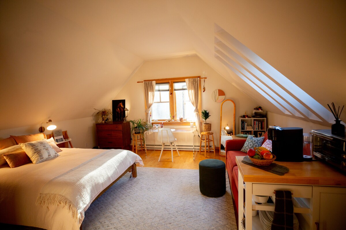 Dobro došli u „Potkrovlje“. Prostor na potkrovlju na poslednjem spratu drvene štale. Vlasnici su dizajneri/graditelji koji su kombinovali elemente stare svjetske izrade sa visokom tehnološkom efikasnošću kako bi stvorili životni prostor koji je svijetao, prozračan, a ipak udoban. Pokreće je solarna energija, ova pripojena štala za kočije nalazi se na tihom sporednom putu 3,5 milje od sela Vudstok i 3 milje od GMHA. Potkrovlje ima svoj privatni ulaz, parking i balkon sa pogledom na zalazak sunca. Za više informacija posetite @theloft.vt