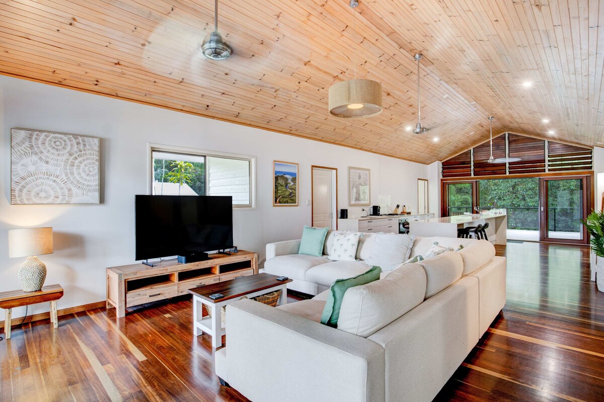 Doživite vrhunski smještaj uz plažu u našoj kući s 3 kreveta i 3 kupatila. Uživajte u zadivljujućem pogledu na okean, privatnom bazenu i direktnom pristupu plaži. Dobro opremljena kuhinja. Opustite se u luksuznoj udobnosti za do 6 gostiju koji su odlični za 2 porodice. Praktično se nalazi u blizini seoskog zelenila sa prodavnicama i restoranima. Rezervišite sada za nezaboravan odmor uz obalu. (Nije prikladno za djecu do 2 godine, otvorene prostore i 3 sprata stepenica) 😊