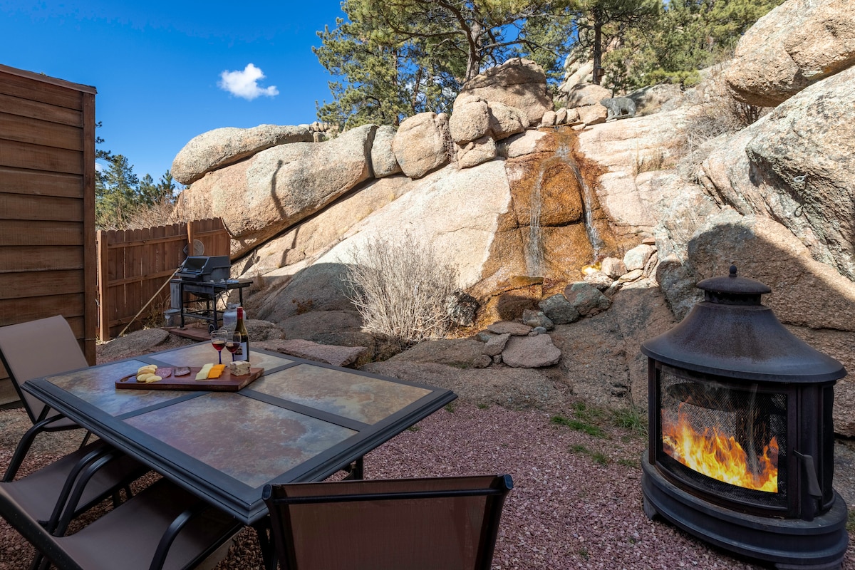 Welcome to your luxurious mountain retreat at Eagle Ridge! The Living Room is a stunning 1400 sf newly renovated home situated in a gated 43-acre property with panoramic views of Pikes Peak that will take your breath away. With a magnificent 1200 sf patio and access to private walking trails, this space has everything you need for a peaceful and rejuvenating vacation or retreat -- a hotel penthouse experience on ground level. The hot tub is filled with fresh water for every guest.