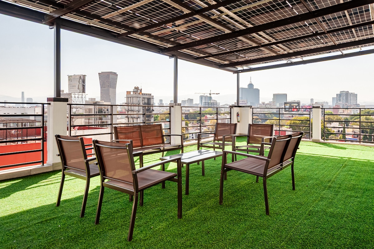 Uživajte u elegantnom doživljaju u ovom smještaju koji se nalazi u centru grada. Sa privatnim unutrašnjim dvorištem, možete da izađete na jutarnju kafu ili cigaretu sa prijateljima. Nudimo vam opuštajući i udoban boravak. Nalazimo se ispred WTC i Pepsi Centra. Zgrada je veoma tiha i udaljena je nekoliko metara od mjesta kao što su Walmart, Starbucks, Cantina la No 20, Dominos Pizza, Insurgentes, između ostalog.