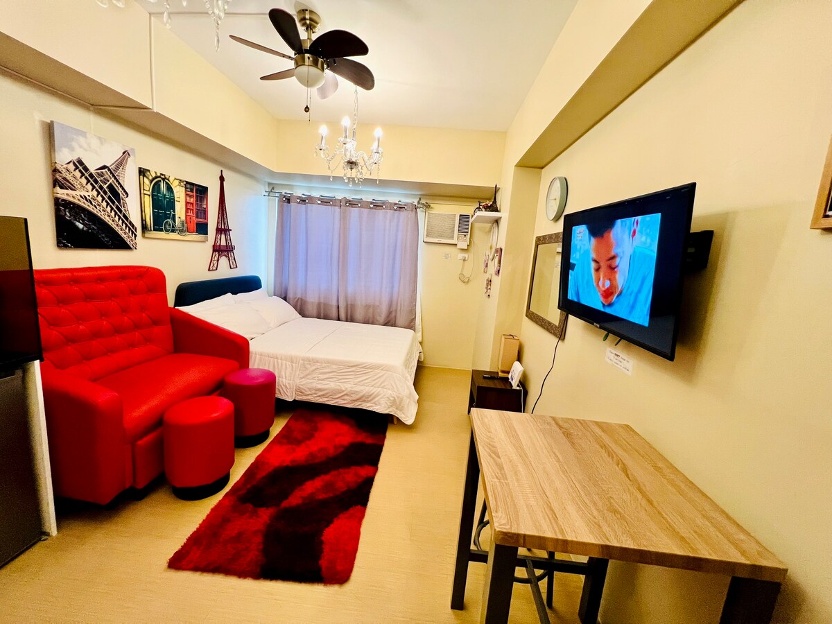 Dobro održavana studio jedinica(za 3 osobe) u srcu grada u blizini tržnog centra Ayala Centrio. Na 15. spratu sa bračnim krevetom i velikim kaučem. Ovo su 4 susjedne studio jedinice (ako ste u velikoj grupi do 12 osoba). Opremljen je brzom Wi-Fi mrežom (200 MBps) Globe Parafiber, Smart TV-om i Netflix-om. Potpuno opremljena kuhinja s kompletnim priborom i BESPLATNIM galonom vode za piće. S pogledom na izuzetno lijep bazen(bazen za odrasle i djecu). U blizini se nalaze prodavnice hrane, prodavnice veša, prodavnice i barovi koji su dostupni non-stop. Rezervišite odmah