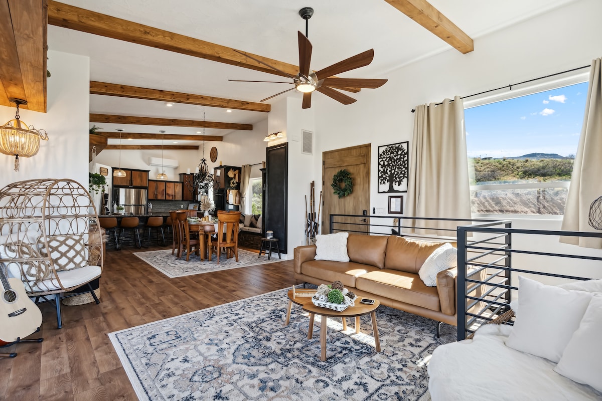 Probudite se uz balone na topli vazduh iznad crvenih stena Sedone. Pozdravite druželjubive koze, pokupite sveža jaja ili se opustite pored ognjišta pod zvezdanim nebom. The Gem je privatno utočište na litici od 2 hektara sa panoramskim pogledom na Draj Krik – samo 10 minuta od najpoznatijih staza u Sedoni. Kućni ljubimci uvek borave besplatno uz pristup privatnom, potpuno ograđenom dvorištu. Starlink Wi-Fi, Roku televizor, potpuno opremljena kuhinja, mašina za pranje/sušenje veša i parking za prikolicu. Omiljen je kod više od 600 gostiju i stalno se svrstava među najbolje smeštaje u Sedoni.