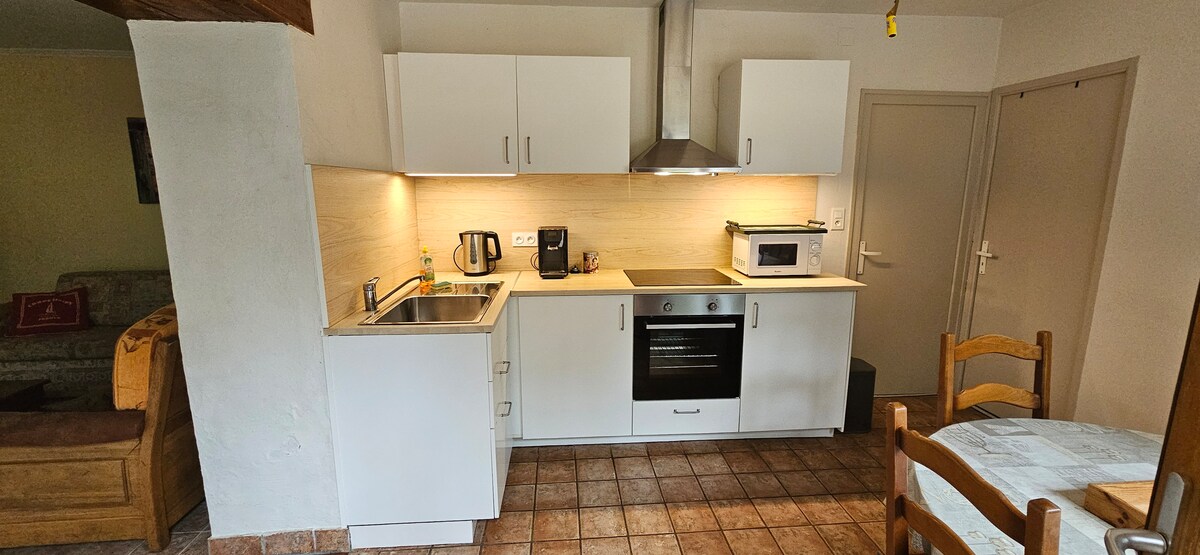 Šarmantni stan s opremom za kuhanje Dobro došli u naš udoban, potpuno opremljen stan koji se nalazi na kraju naše velike kuće. Uživaćete u dnevnom boravku sa sofom na razvlačenje, prostranoj spavaćoj sobi, funkcionalnoj kuhinji i tuš kabini. Idealno za miran boravak, okružen prirodom i 10 minuta od sadržaja i autoputeva Ako želite, možete uživati u baštenskom namještaju i stolu i stolicama .