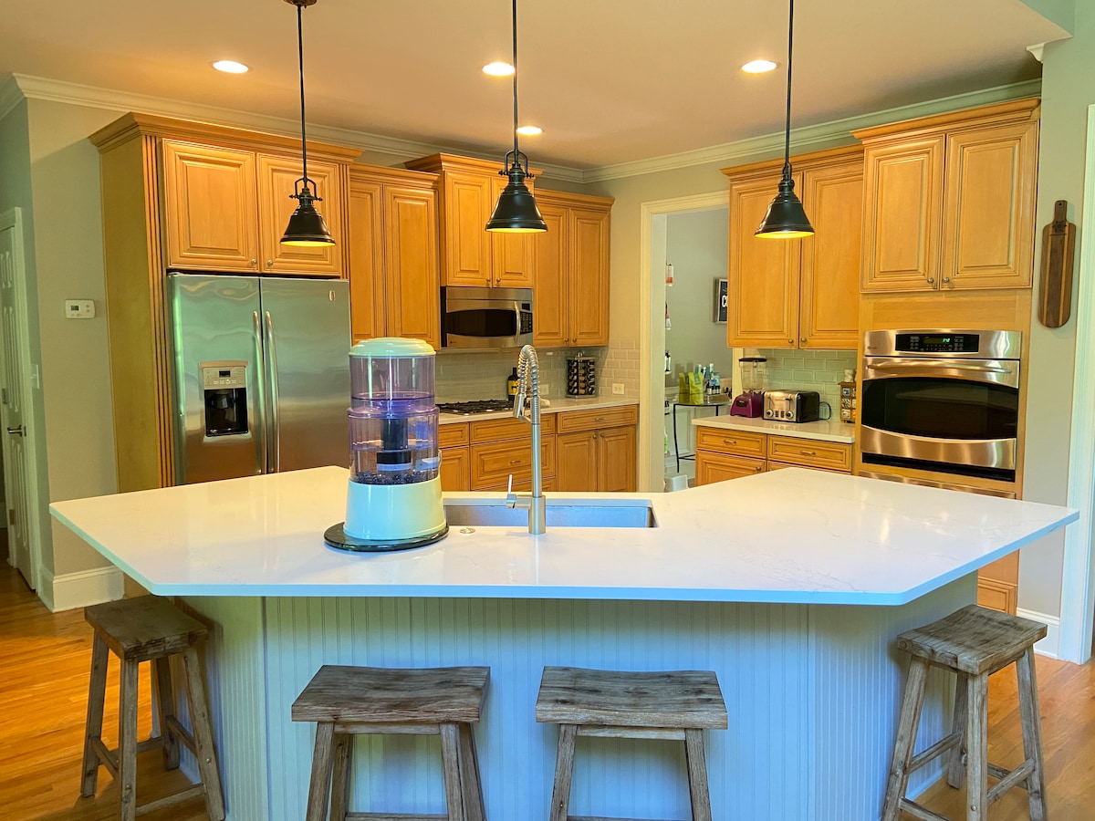 Prostrana pametna kuća sa 4 spavaće sobe, 7 kreveta i 4 kupatila u blizini Šarlota, aerodroma CLT i parka Kerovinds. Svaka spavaća soba ima privatno kupatilo i tamne zavese. Uživajte u privatnoj teretani, televizorima od 80 inča, muzici koju pušta Aleksa i zvučnicima u tušu. Potpuno opremljena kuhinja sa vrhunskim aparatima, komercijalnim frižiderom i aparatom za kafu. Prednji trem, ograđeno dvorište, unutrašnje dvorište i dvospratna terasa.