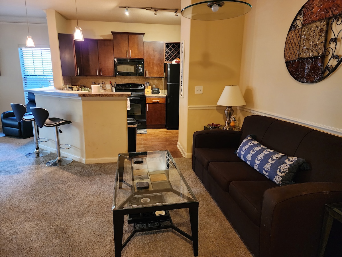 Experience luxury in our stylish 1BR apartment, conveniently located near local attractions, restaurants, and transportation. Enjoy a fully equipped kitchen with quartz countertops & high-end appliances, in-unit laundry, and spacious closets. Complimentary parking and high-speed WIFI provided. Relax in the resort-inspired salt-water pool, grilling area & fire pit, fitness center, and dog park. Accessible ground-floor unit with private walk-up patio. Ideal for a comfortable and convenient stay.