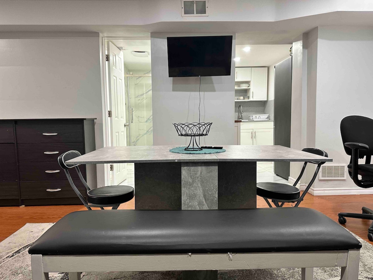 Cozy, bright, furnished basement studio with high ceilings and private entrance. Ideal for short-term visitors at Sheppr/Bathurst area. This place includes a small kitchen, in-suite washer/dryer, full bath, TV, and Bell 5G internet. Netflix and Prime streaming available. Great location: 10 min to Hwy 401, groceries, restaurants, and Subway to Downtown, Pearson Airport, and and a 5-min ride to Rogers Stadium . Quiet, smoke-free, pet-free home. Loud and late-night party is not welcome!