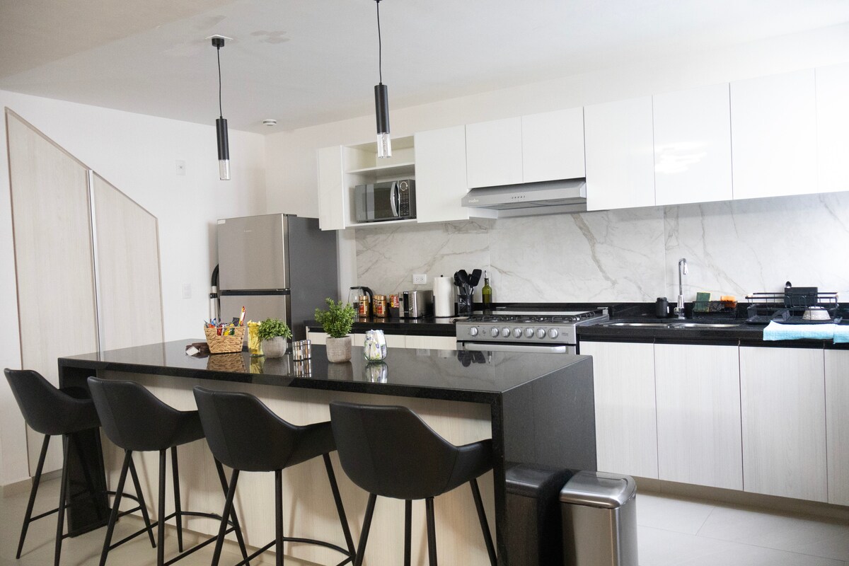 New, fully equipped house in residential Reserva Bosque Sereno, Aguascalientes, with 24/7 security. Spacious, modern, and equipped with everything you need for a comfortable fall stay. Just 10 min drive from downtown. Comfortable rooms, full kitchen, living room, dining room, 3 TVs, washer/dryer and AC. Green area, basketball court, soccer field, grills, and shared pool. Ideal for relaxing after exploring Aguascalientes and its surroundings. The best accommodation awaits you, book now!