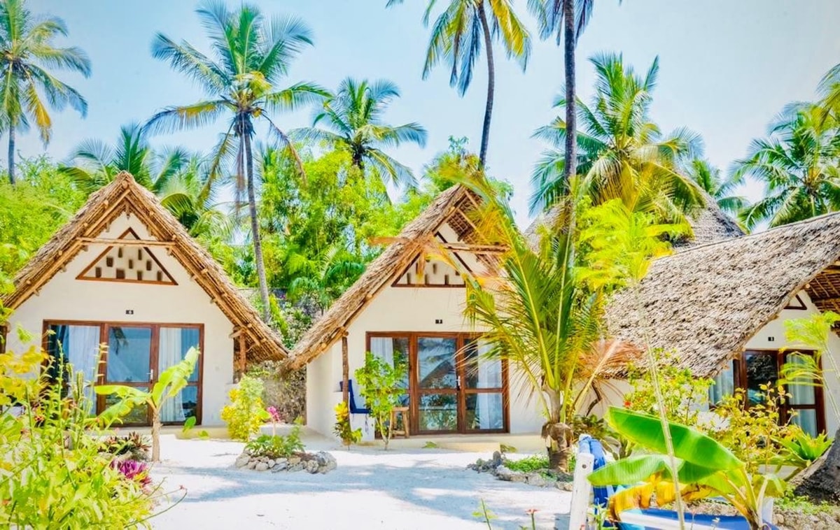 Sve naše dvokrevetne sobe napravljene su od prirodnih materijala i nude fantastičan pogled na more. Unutrašnjost bungalova nudi vam bračni krevet sa ugrađenom mrežom za komarce, kvalitetnim dušekom i posteljinom, zidni ventilator koji cirkuliše. Mali sto i tradicionalni zanzibarijski ručno izrađeni ormar upotpunjuju prozračne enterijere naših bendova.