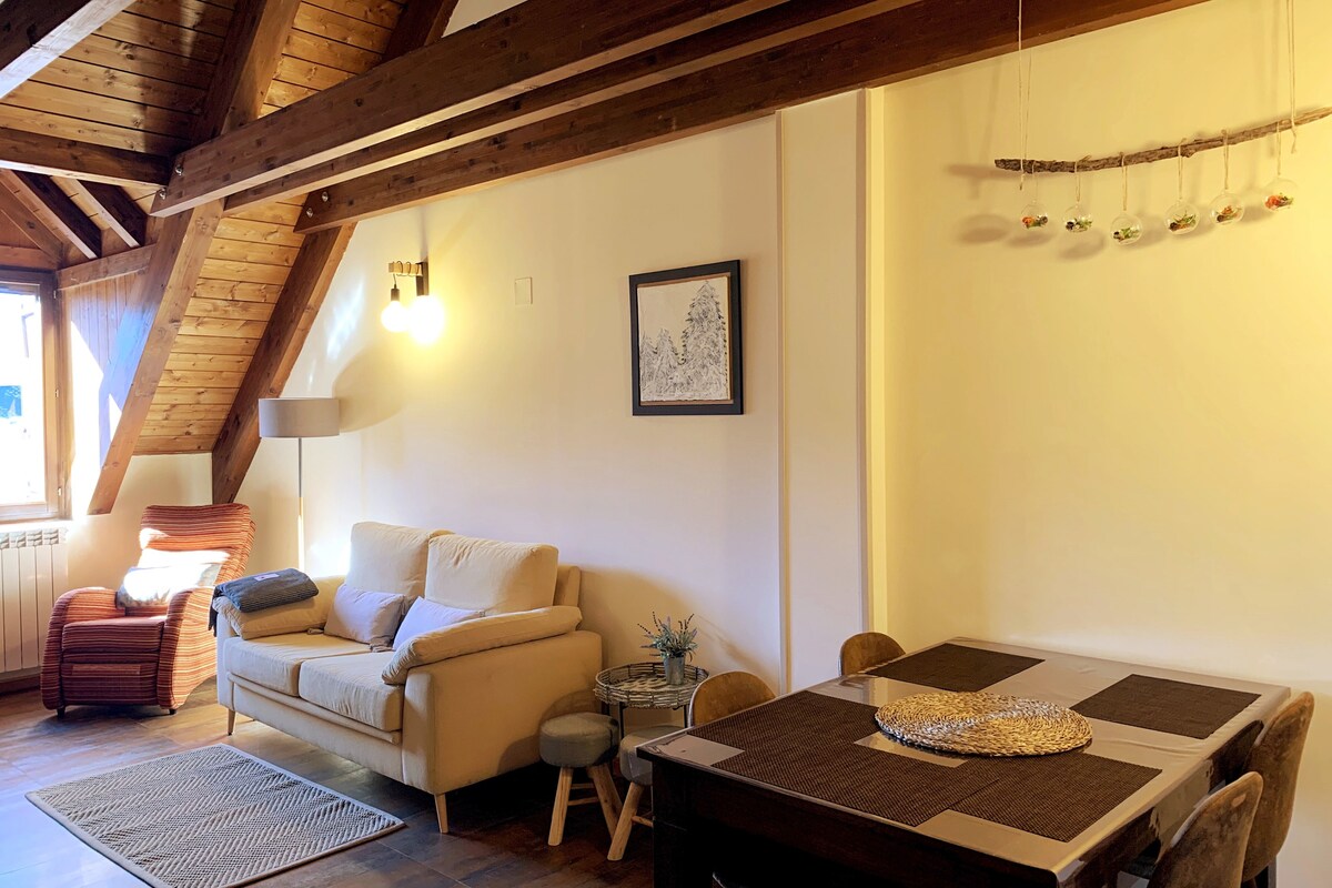 Topao jednosoban stan u potpunosti opremljen za kraće ili duže boravke, na odličnoj lokaciji za uživanje u glavnim atrakcijama koje nude Aragonski Pirineji. Želimo da se osjećate kao kod kuće, pa ćete imati na raspolaganju: - Potpuno opremljena kuhinja - Kupatilo sa kadom i toplom vodom - Skladište je dostupno za bezbjedno skladištenje sportske opreme. - Možemo da vas vodimo: biciklističke rute, planinarenje, degustaciju vina, slobodno vrijeme itd.