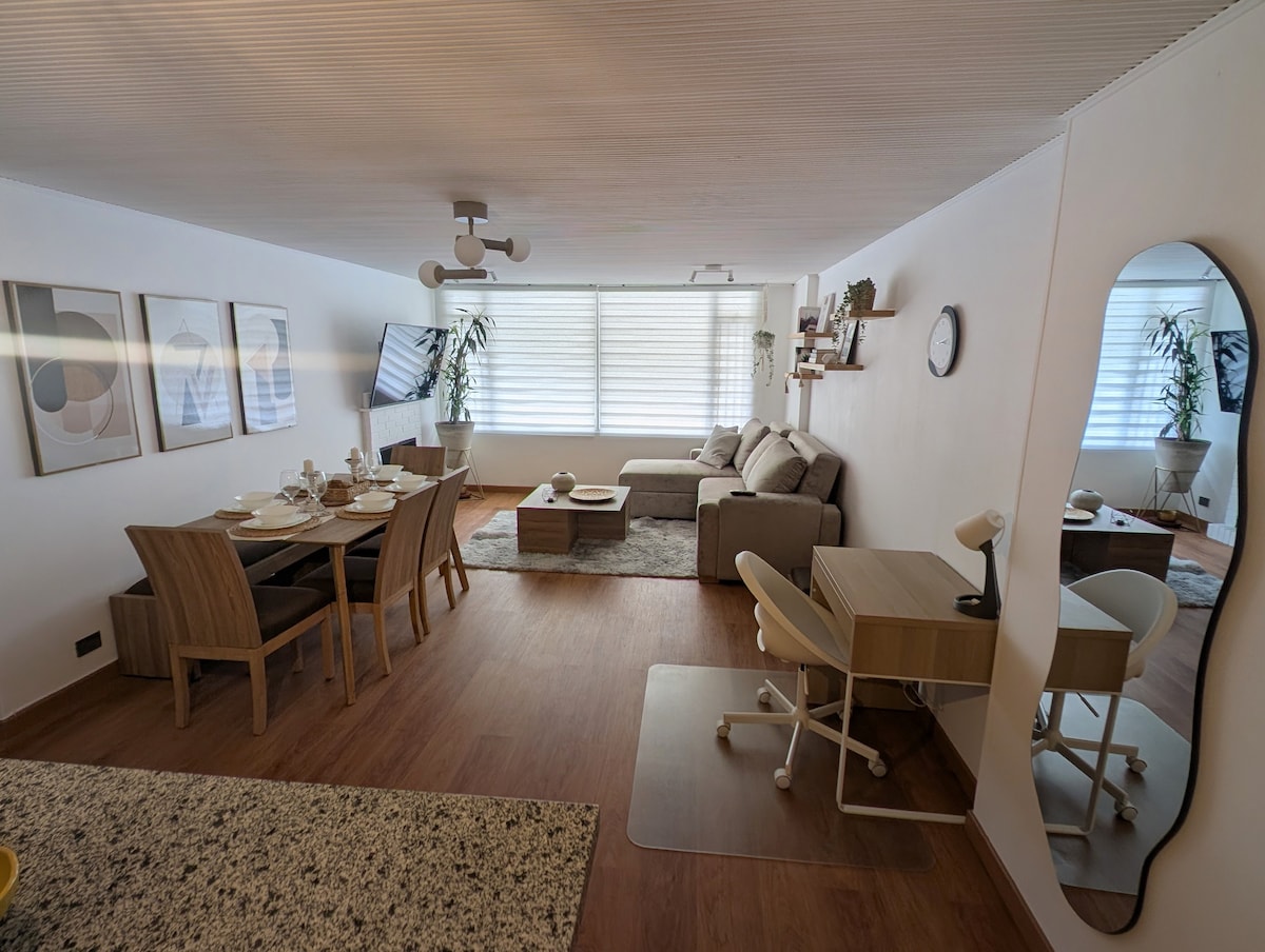 Este apartamento es ideal para quienes buscan confort, tranquilidad y ubicación estratégica en Bogotá. Cuenta con dos habitaciones, la principal con una amplia cama king y baño privado. La segunda habitación cuenta con cama doble. La sala ofrece un espacio cómodo y cálido para relajarse; tienes disponible chimenea y televisión para disfrutar momentos acogedores. Su cocina es amplia y completamente equipada es perfecta para cocinar como en casa, acompañada de un comedor para seis personas.