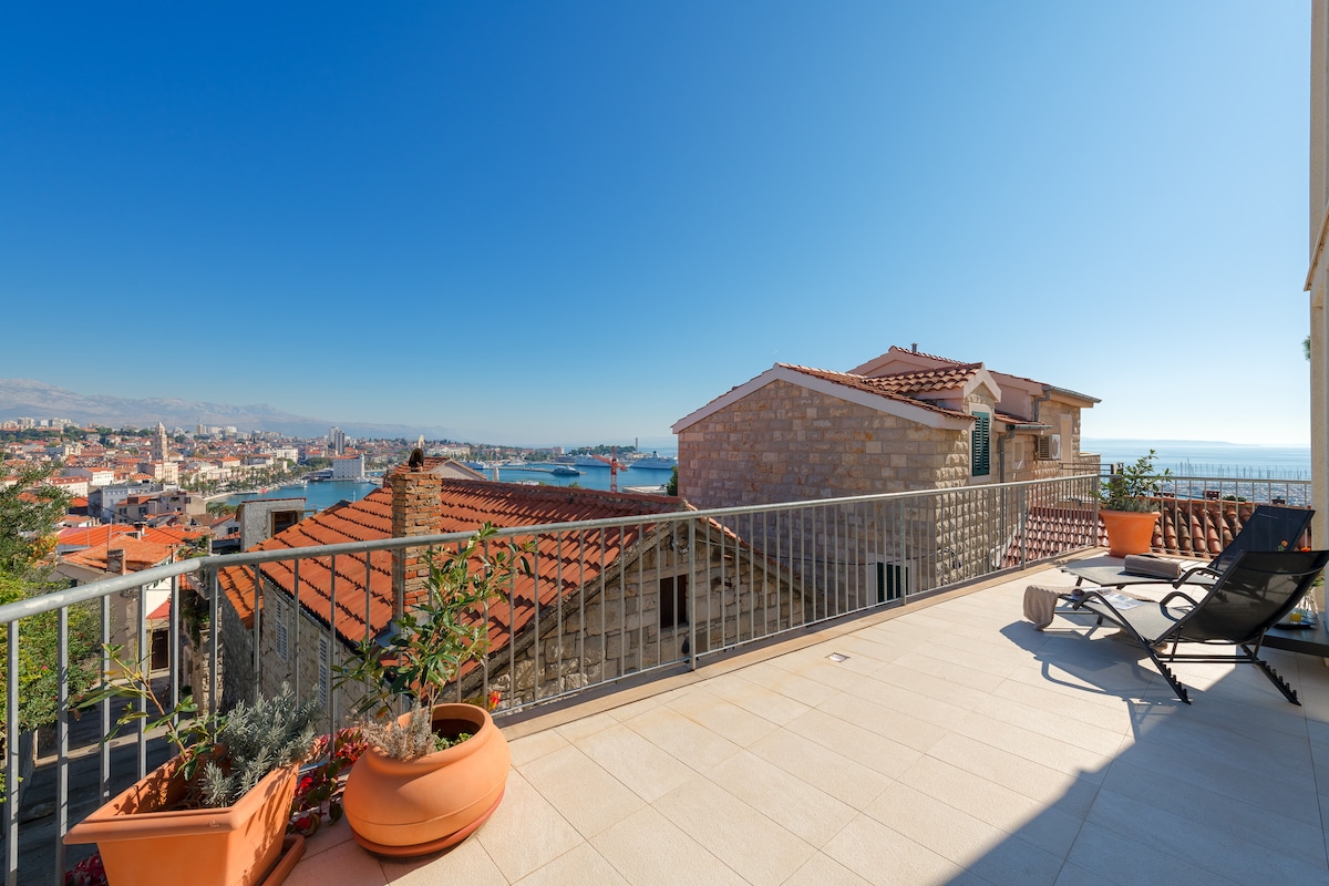 ZATRAŽITE NAŠE PROMOCIJE VAN SEZONE ZA DUŽE BORAVKE - 1. NOVEMBAR - 1. APRIL! Jedinstven luksuzni stan nalazi se na savršenoj lokaciji, odmah iznad Dioklecijanove palate. Da biste došli do obale, uživaćete u kratkoj tri-minutnoj šetnji kroz najšarmantniji dio Splita sa porodicom. Uživaćete u najboljem pogledu u gradu sa naše velikodušne (60 m2) terase. Iza vile se nalazi ogroman park/šuma Marjan, koji nudi plaže, staze, mnoge mogućnosti da se oseti Mediteran kao nekada.