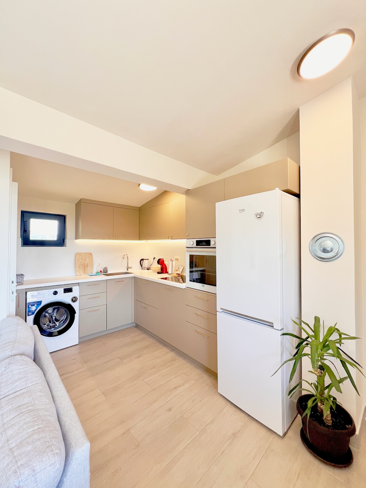 This apartment includes; 1 bedroom, 1 bathroom, kitchen with dining area and sofa that opens into a third bed, terrace with sea view. We are just 100m from a grocery store, bus stop, and restaurant/bar. Also 500m from the beach. **Please note the Touristic Tax is not included in our prices**